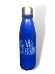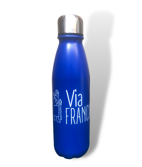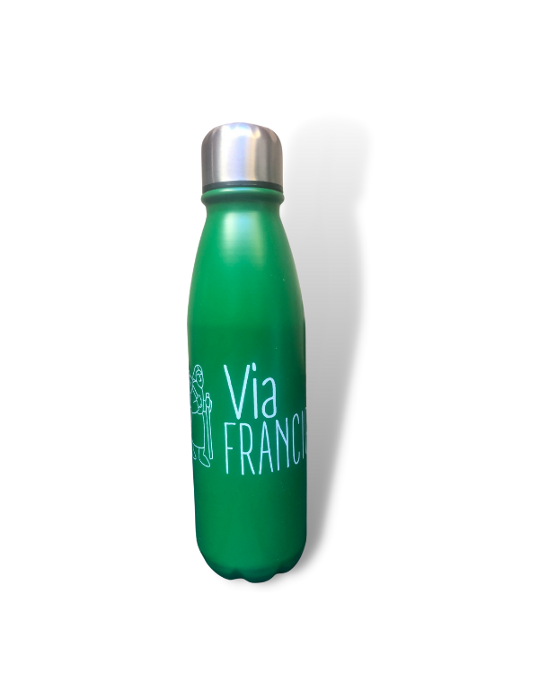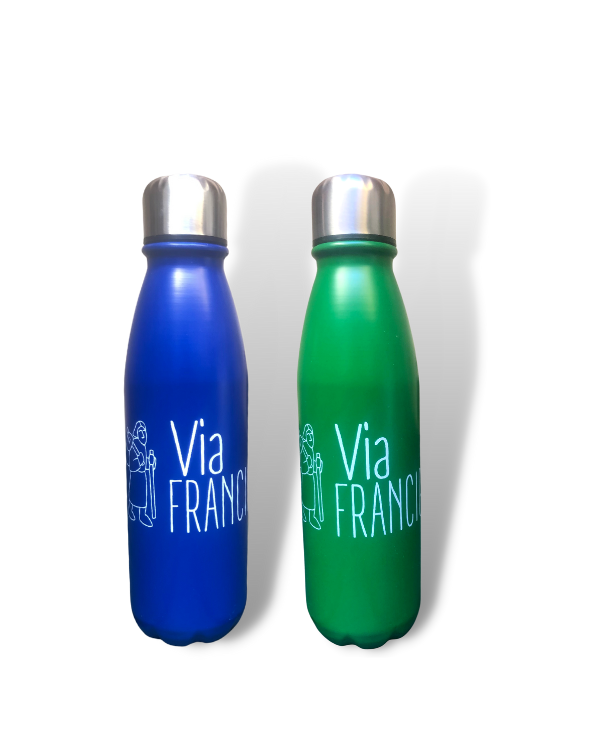 Die Via Francigena Thermosflasche – Refill Now ist 0,6L groß und besteht aus blauem oder grünem Aluminium mit dem offiziellen Logo der Via Francigena.