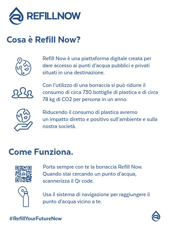 Refill Now, ein nachhaltiges Projekt, das von einem italienischen Start-up-Unternehmen entwickelt wurde und privaten Unternehmen und Reisezielen helfen soll, den Verbrauch von Plastikflaschen und -materialien zu reduzieren.