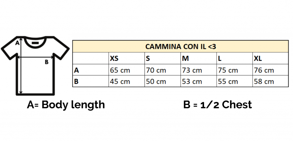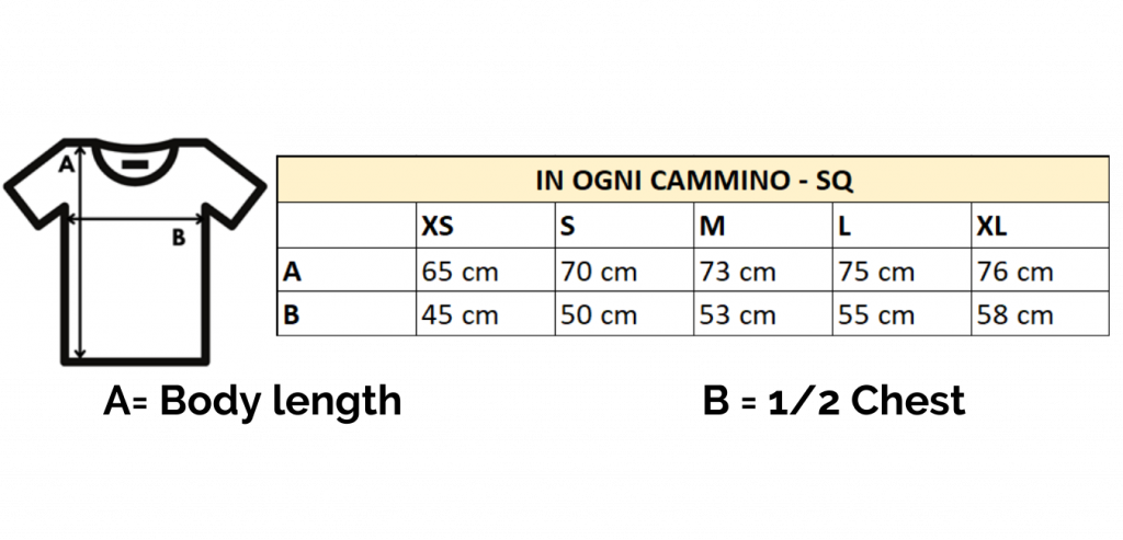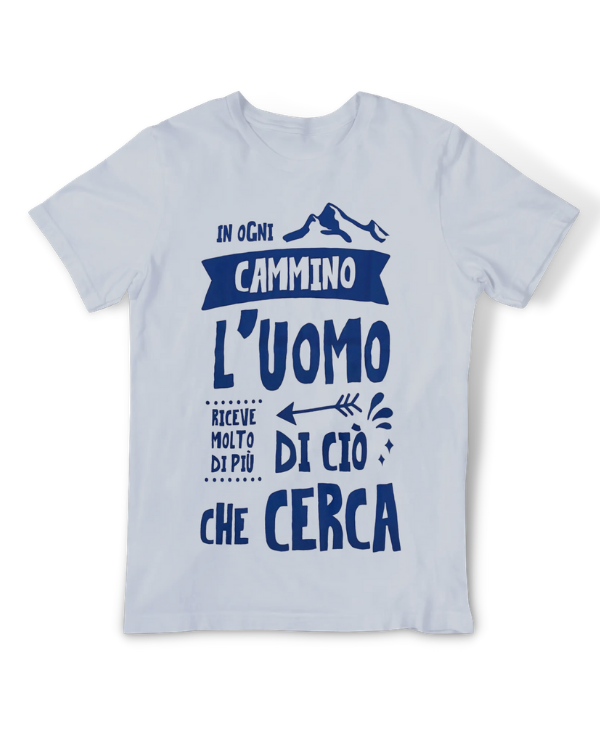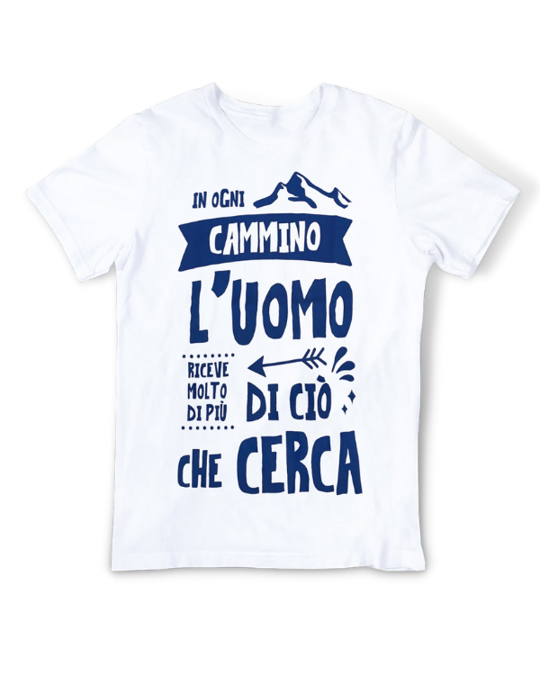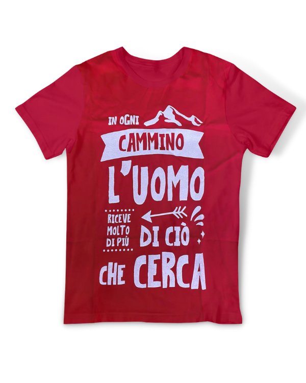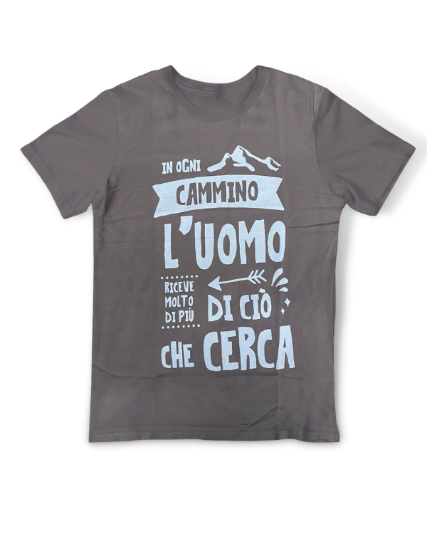 The “In Ogni Cammino” T-Shirt (“In Each Path, Man receives much more than he is looking for”) is 100% cotton, available in various colors and it has the screen printing of “In Ogni Cammino l’Uomo riceve molto di più di ciò che cerca” on the front.