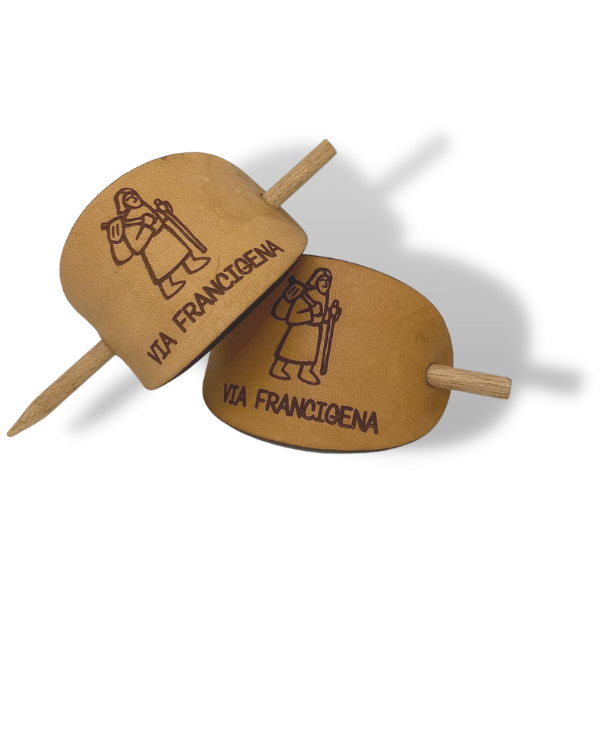 Our Via Francigena Leather Hair clip is made of natural leather with effigy of the pilgrim and written Via Francigena. This includes a natural wood insert.