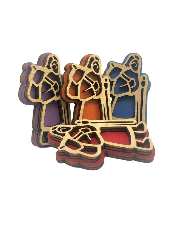 Notre Broche en bois avec effigie du pèlerin, vous pouvez donc l’appliquer à votre sac à dos. Il a le fond coloré en acrylique, donc disponible en différentes couleurs comme violet, rouge, orange et bleu. Toutes les finitions sont naturelles.