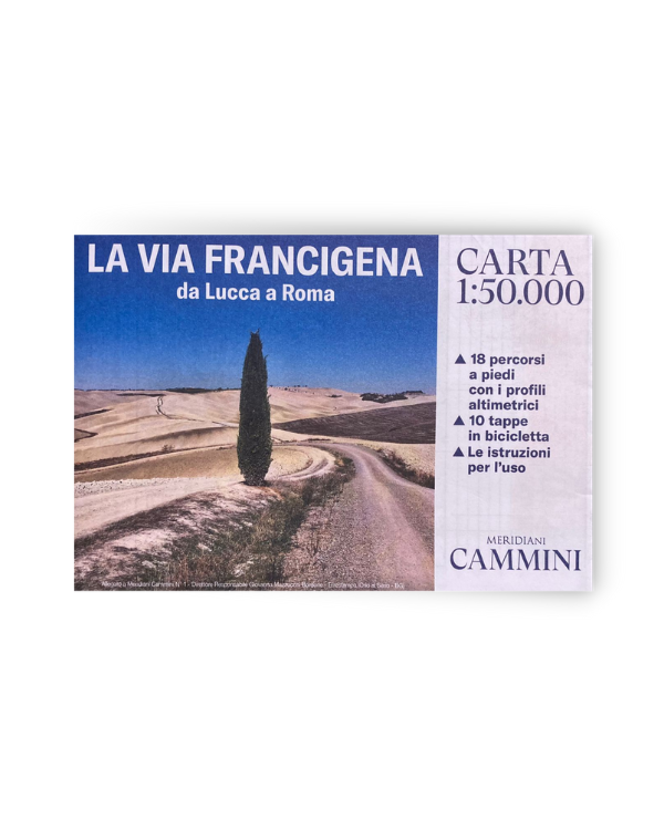 La rivista Cammini La Via Francigena da Lucca a Roma, racconta il percorso a piedi, in bici, con il cane, a cavallo nelle regioni Toscana e Lazio, insieme la cartina (1:50.000) con 18 percorsi a piedi con i profili altimetrici, 10 tappe in biciletta e le istruzioni per l’uso.