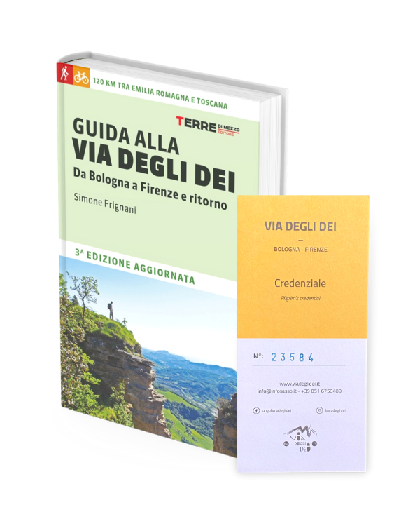 Il Kit Via degli Dei contiene la guida ufficiale in lingua italiana e la credenziale della Via degli Dei con gli spazi per i timbri e le indicazioni indispensabili per il cammino.