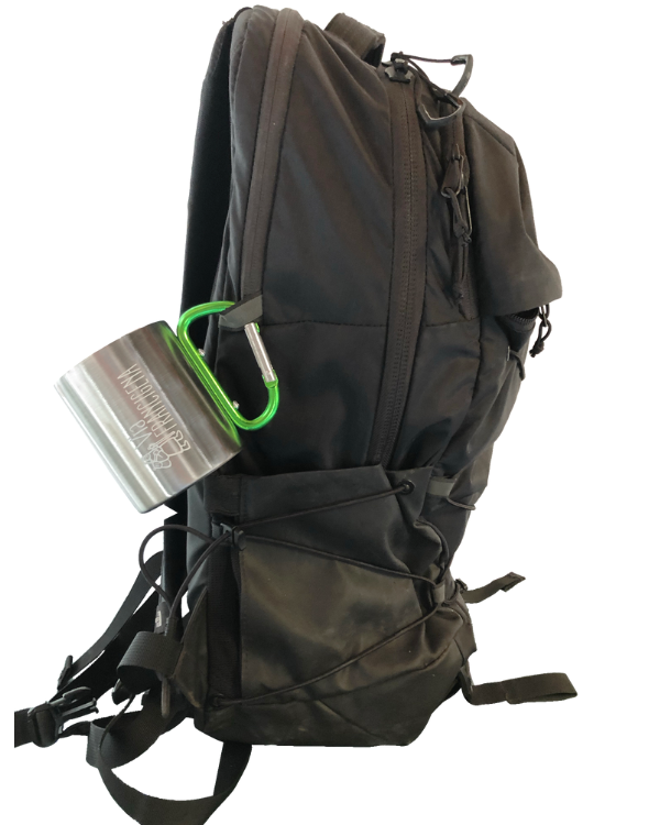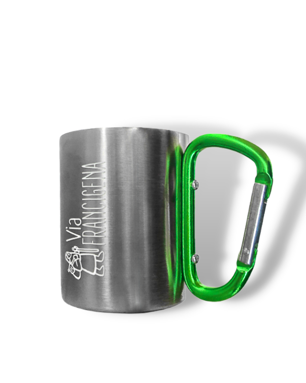 La nostra Tazza con moschettone verde (350 ml) ha stampato il logo ufficiale della Via Francigena.
